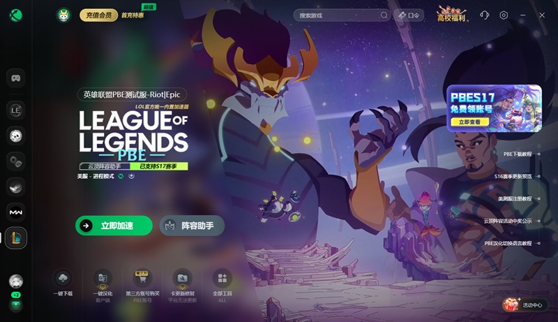 迅游加速器流畅加速PBE美服测试服,支持PBE一键下载、PBE一键汉化、账号获取等。迅游一键加速PBE,有效解决游戏延迟高、掉线、卡顿、卡排队等问题,助力大家流畅游玩PBE。