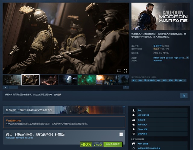 加速成功后,打开Steam电脑客户端或正版官网,搜索“Call of Duty : Modern Warfare”,点击对应游戏进入专属折扣页面,确认当前折扣为1折、售价39.9元,认准官方页面,切勿点击第三方非正规链接,防止被骗。